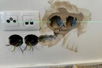 Podomítková elektroinstalace v panelovém bytě s použitém nášlapné vrstvy betonu a vertikálními drážkami k zásuvkám, vypínačům a světlům.detail