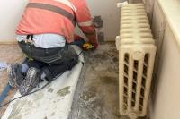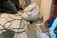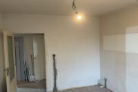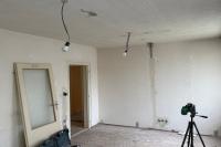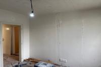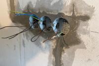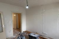 Následně jsme sádrovali krabice KP68/2 a do připravených drážek ukládali kabely. Všechny drážky jsme vyplnili sádrou a po zaschnutí jsme provedli tmelením tmelem UNIFLOT a strojní broušení.